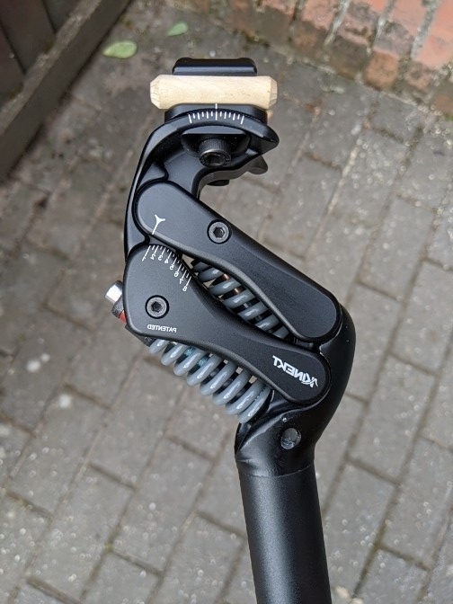 As you can see in the picture the post consists of a parallelogram set up with a longer spring at the bottom and a smaller one inside. The saddle rails do actually look like they are on the wrong way around compared to a traditional seat post but are this way to ensure when the post compresses the saddle stays in the same plane and doesn’t move backwards or forwards excessively. Changing the distance between saddle and