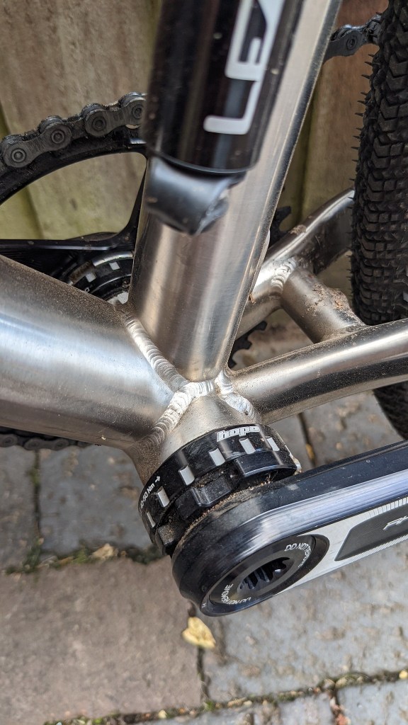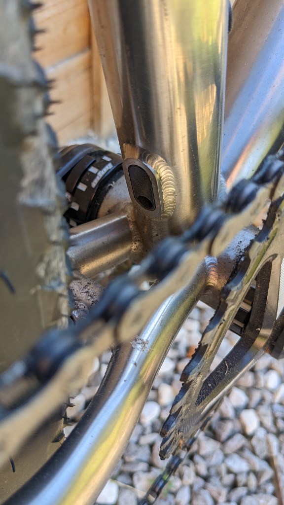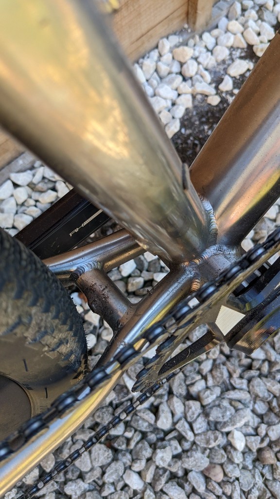 Descending fast on loose gravel brings that “Ting Ting” noise back as small stones hit the down tube but by then you are grinning so much you probably won’t notice. The other good thing about a bare Titanium frame is that blemishes can just be polished out. So if you are serial bike cleaner who loves a shiny bike at all times you will love Titanium!