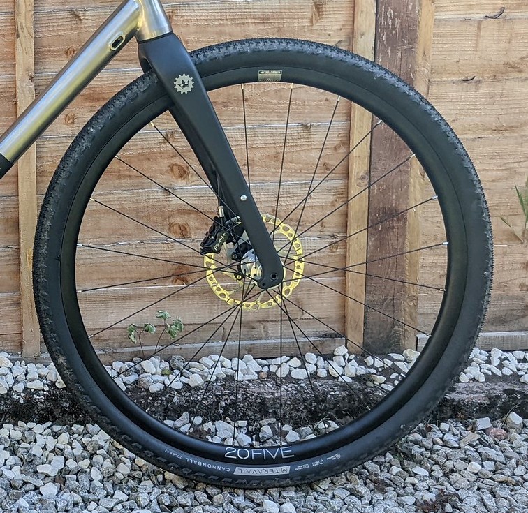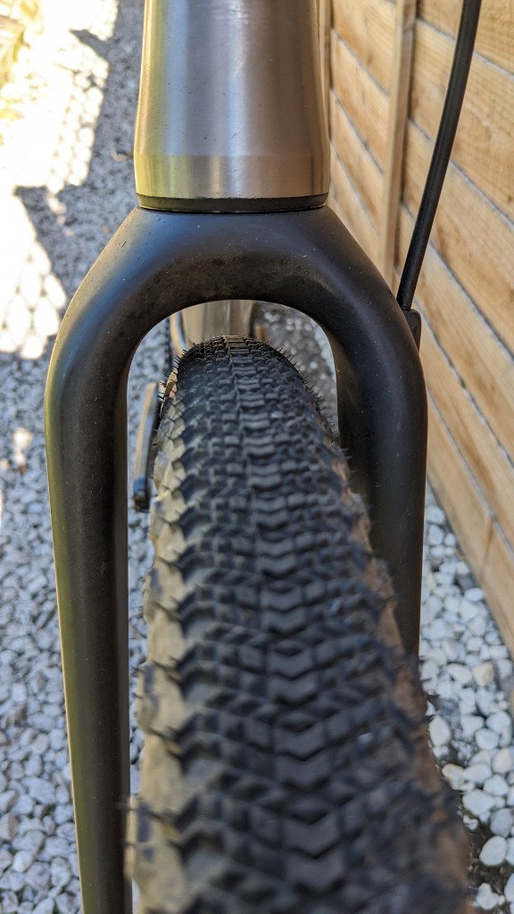 The fork is full carbon fibre, both steerer and blades and has just as generous clearance for tyres as the frame. It comes with mudguard mounts but no other mounts which is quite unusual as Stanton say the bike is ideal for bike packing. The fork has a flat mount brake fitting.