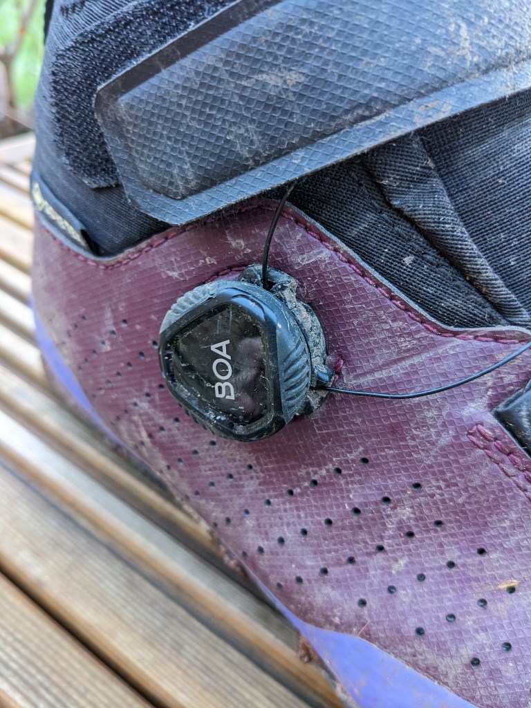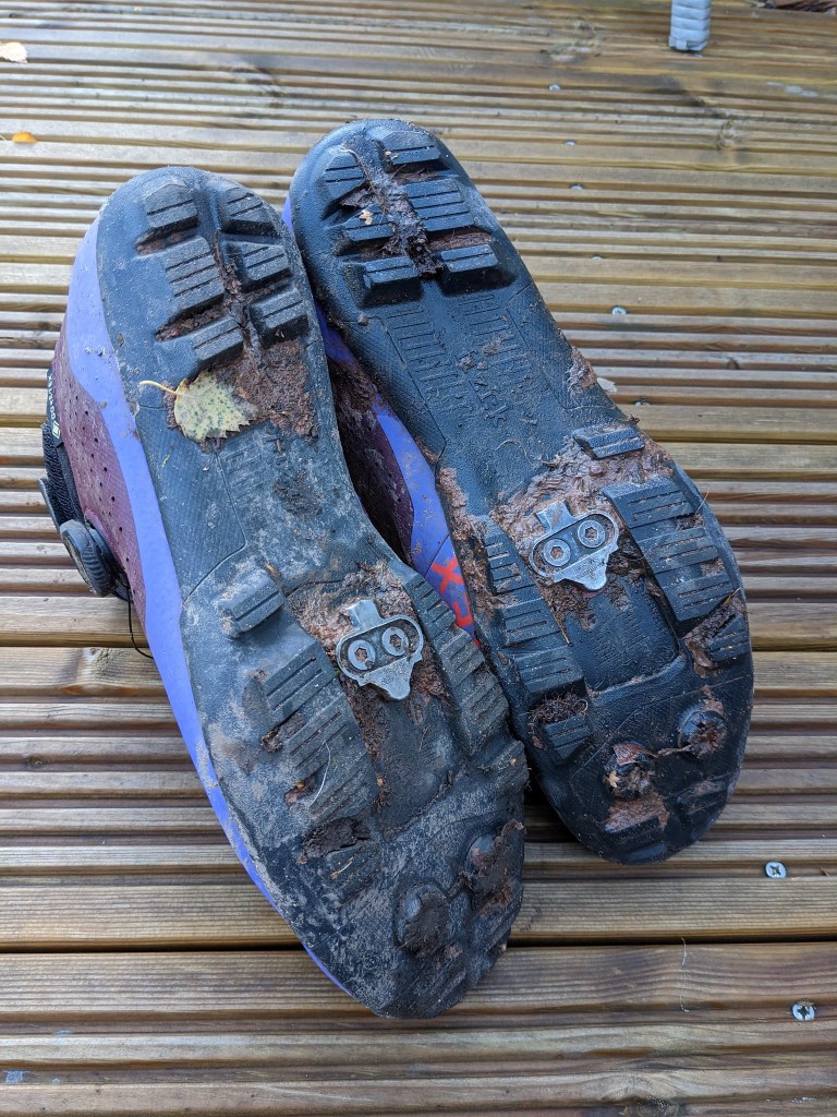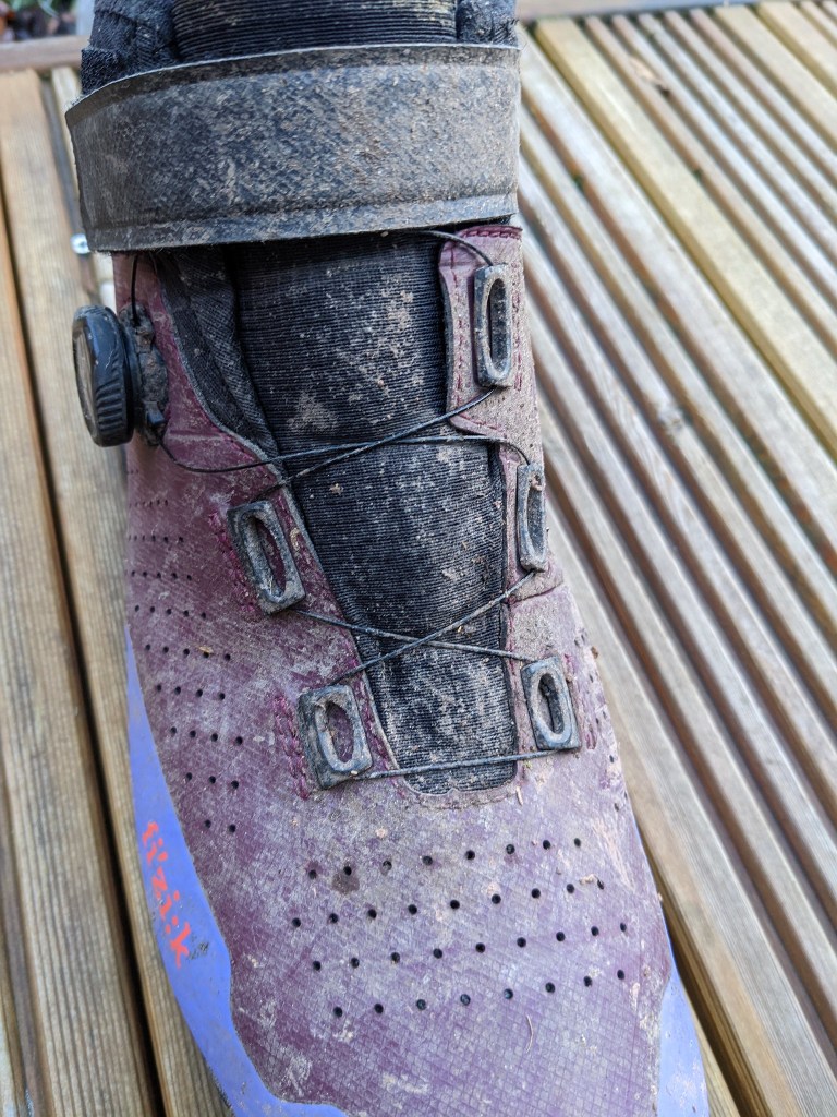 The exterior is made of Polyurethane and it shrugs off knocks and scrapes well. It also cleans off really easily with a sponge and after a few months wear, when I do bother to clean them (who has time for that anyway?) they come up looking almost like new. There’s a velcro strap around the ankle to cozy the collar around your leg and the excellent Boa dial that allows micro fit adjustment and quick release exit. This has the added bonus of not having laces or velcro to get caked in mud that inevitably gets all over your gloves or hands when it come time to take them off and tip toe through the house to the shower. The sole is again the same as on the Fizik Atlas shoe and is grippy in mud and rocks (no material on earth unless it has sharp claws/spikes is grippy on UK winter slime covered tree roots). There is provision for two toe studs per shoe for hike-a-bike duties or running up grass banks in a CX race
