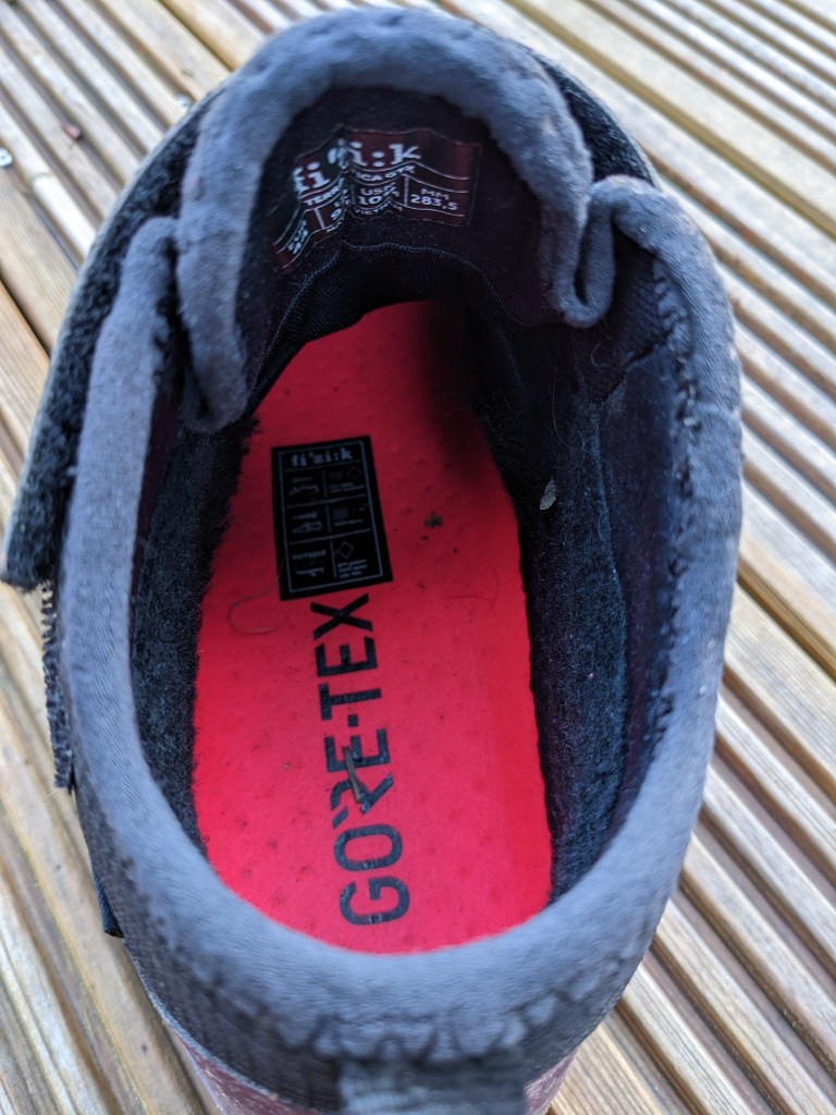 For a start the shoe has that magic coupling of words written on it, “Gore-Tex” this at the very least reassures you that good quality components have been used and that Fizik hasn’t just come up with their own new waterproof membrane to save costs. The fact that they use Gore-tex indicates to me they want this shoe to do everything they claim it can. The actual membrane is called “Koala” and is not only meant to be waterproof, it’s supposed to be breathable too. This is quite possibly more important. Unbreathable shoes make your feet sweat, your socks get damp and then that damp gets cold and soon after so do your feet. So a water proof and breathable membrane is perfect for a shoe that will face low temperatures, water and have to cope with you exercising and producing perspiration. I’ll be honest, to cope with all that is a big ask and I was sceptical that Fizik’s claims might be a bit out there.
