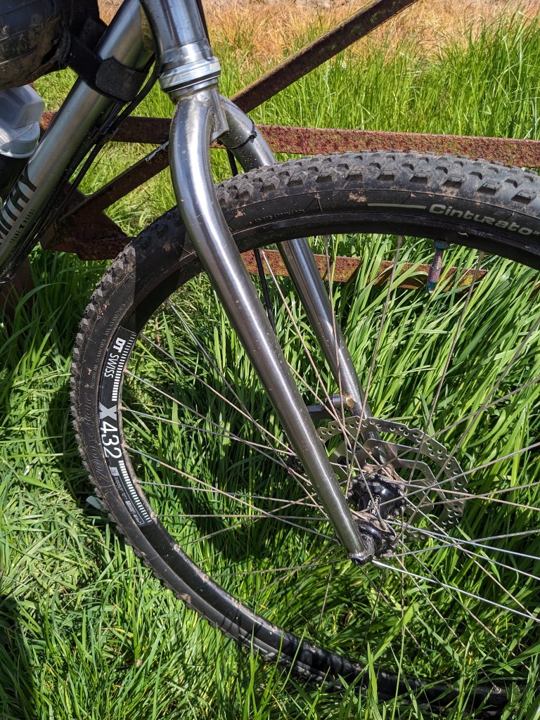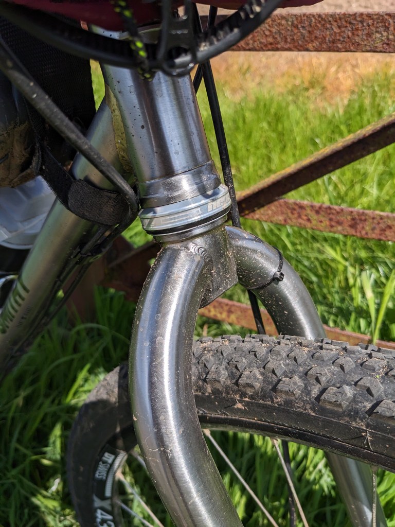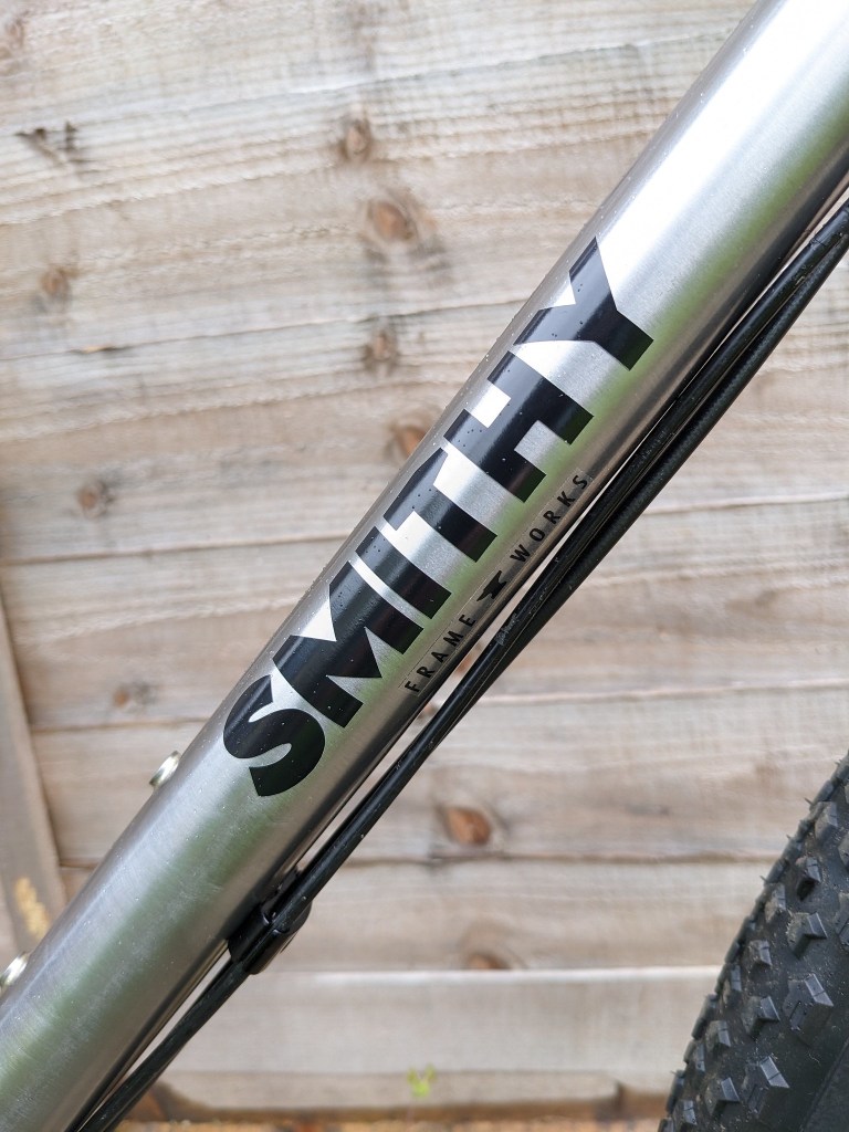 The most surprising part for me was the fork, I’ve ridden a few steel MTB rigid forks and as they are usually longer length they are generally not too harsh (29″ suspension corrected forks). The Smithy FW fork is shorter and yet seemed to soak up all the chatter from the pebbles and roots. Look down when riding and you can see the very slight fore-aft flex that makes them feel so good. Climbing or sprinting though there’s no unwanted side to side movement. I think this explains the tarmac performance and the road holding in turns.