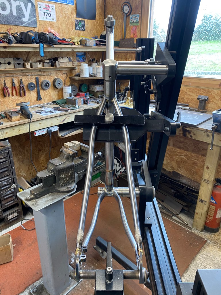 The whole process from start to finish took just over a week. This was because Chris had most of the tubing in stock apart from the flat mount bolt through rear dropouts. It was also quicker as we decided to just add a very light clear coat on the frame. We did this for two reasons. 1 – It shows of the braze-welds to good effect, and i think looks awesome! and 2 – This frame set will be for sale after the review and so the new owner can have the clear coat removed and paint it what ever colour they want. Chris has a great paint shop contact so he can arrange that too.