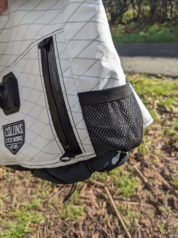 The Pack has two mesh pockets on the ends and a zipped pocket on the front. I put my house keys and multitool in the end pocket and my phone in the zipped pocket. All three of these pockets are easily accessible while riding. Even the zip pocket was easy to open and close with gloved hands for those last minute instagram snaps and reels (yes, i am that sad) I was happy to have my phone under just the Xpac fabric as it just looked as if it would keep the phone moisture free. There is a very useful bungy cord on the bottom of the bag and I stashed my waterproof jacket under there, it stayed put throughout.