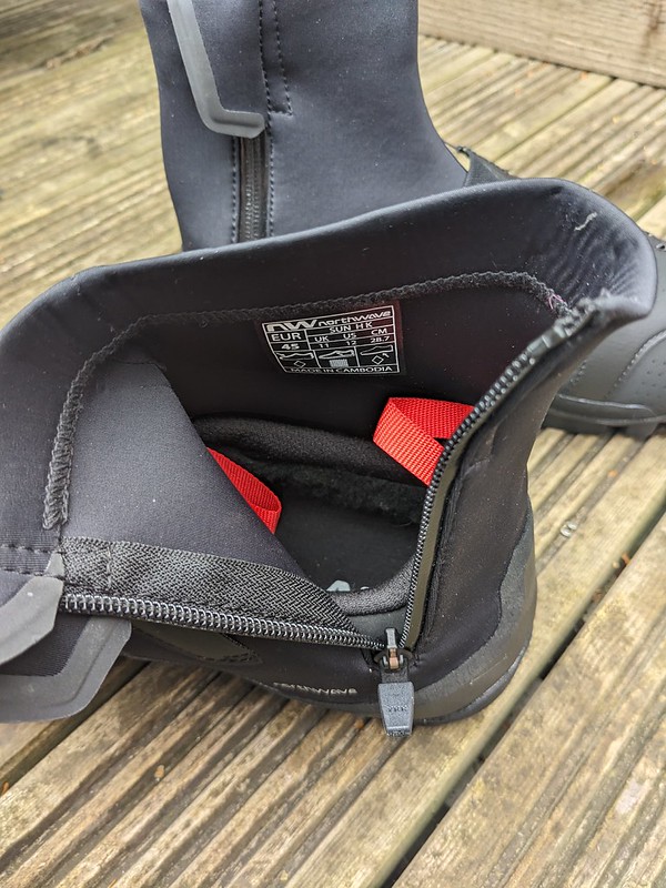 Enough of the jargon, what are they like to wear? Well i asked for a size larger than my normal summer shoe size as I intended to run thicker or waterproof socks with them and Northwave agreed that was a good idea. With a thicker sock on my feet I attempted to put them on for the first time. There’s definately a knack to it. Inside the shoe are two red straps to aid pulling them on and they are needed. It was a bit of a wrestle to be honest and i was instantly worried I needed an even bigger size. However once on and my socks straightened by wiggling my feet in the shoe they felt totally the right size and i had plenty of toe wiggle room. Infact they are sort of T.A.R.D.I.S like as they seem bigger when on than when putting on if that makes sense?