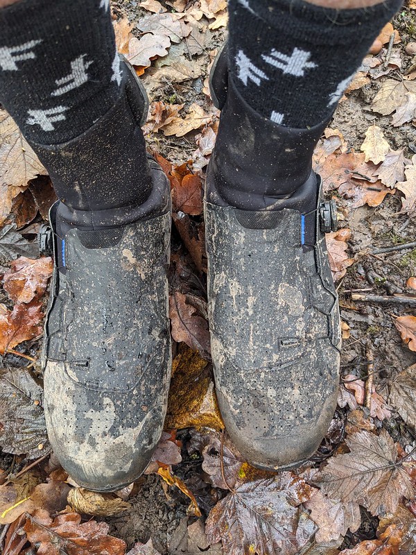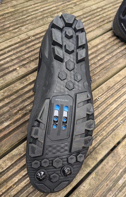 the sole has a very generous amount of cleat adjustment, I’d go as far as saying the most I’ve experienced on any clip in shoe. I set it as far back as it could go thinking the shoes were like most others and soon realised I had to move the cleat back towards the toe which is unheard of in my experience! The sole is aggressive and there’s lots of grip even without the toe studs for hike a bike sections. The close spaced knobs will get clogged with clay and leaves (your soil conditions may be different) but a quick bang on the pedals soon clears them though. Taking of walking, the sole has just the right amount of flex for trotting up muddy trails and lets face it more importantly they won’t make you look like a penguin when walking up to the counter in your favourite coffee/cake/chip shop/pub. Despite this flex there is plenty of stiffness at the cleat for efficient pedalling.