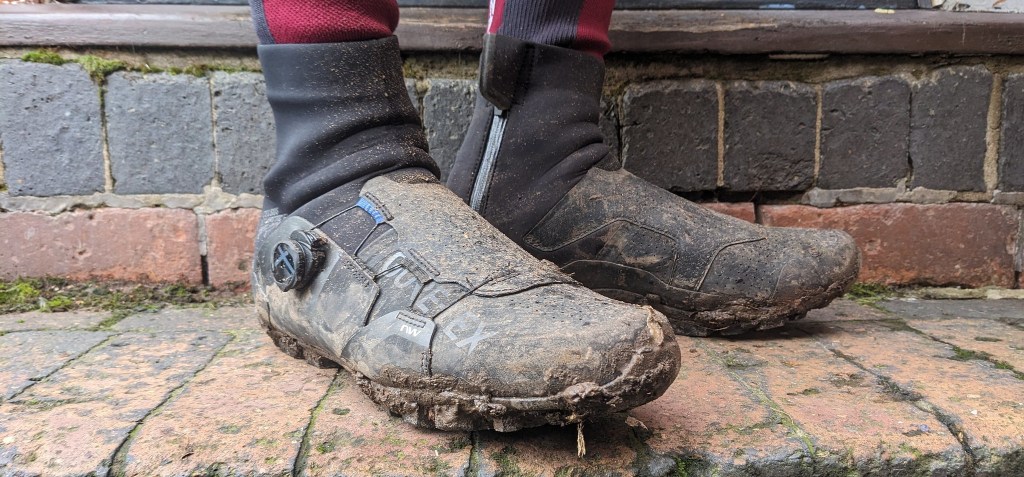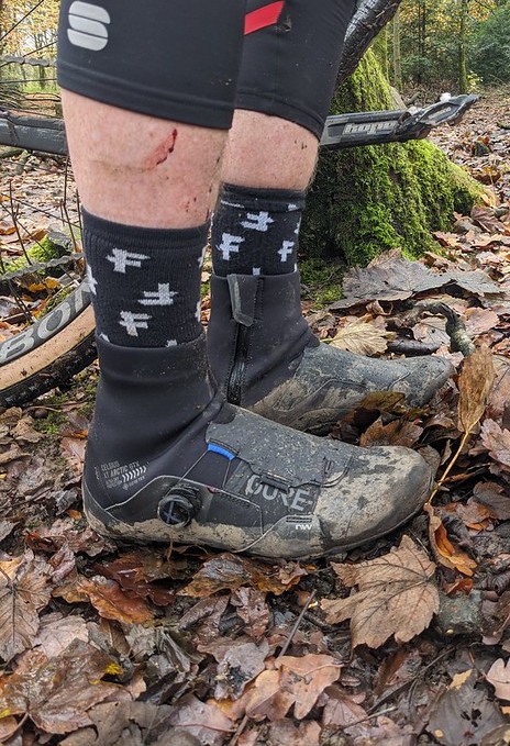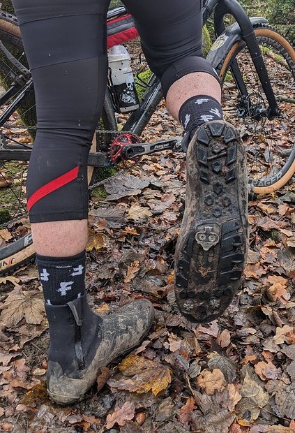Are they waterproof then? the shoe part of the “boot” definately is, i know this because I deliberately on your behalf pedalled my bike through all the floods, stood in X-dial deep puddles and tried to (unsuccessfully) leap across a ford. The neoprene cuff though isn’t, it’s weather proof but will eventually get damp from spray. Bear in mind though that there’s a big hole in the shoe where your foot goes in so a wet sock cuff is equally caused by water running down the leg of my waterproof trousers as much as the neoprene. The good thing about neoprene though and why it’s excellent as a wet suit is that despite being damp it still insulates the wearer by trapping body heat. On the wettest day when i removed the shoes the top of my sock was damp but from the ankle down was as dry as when I put them on.
