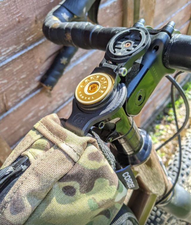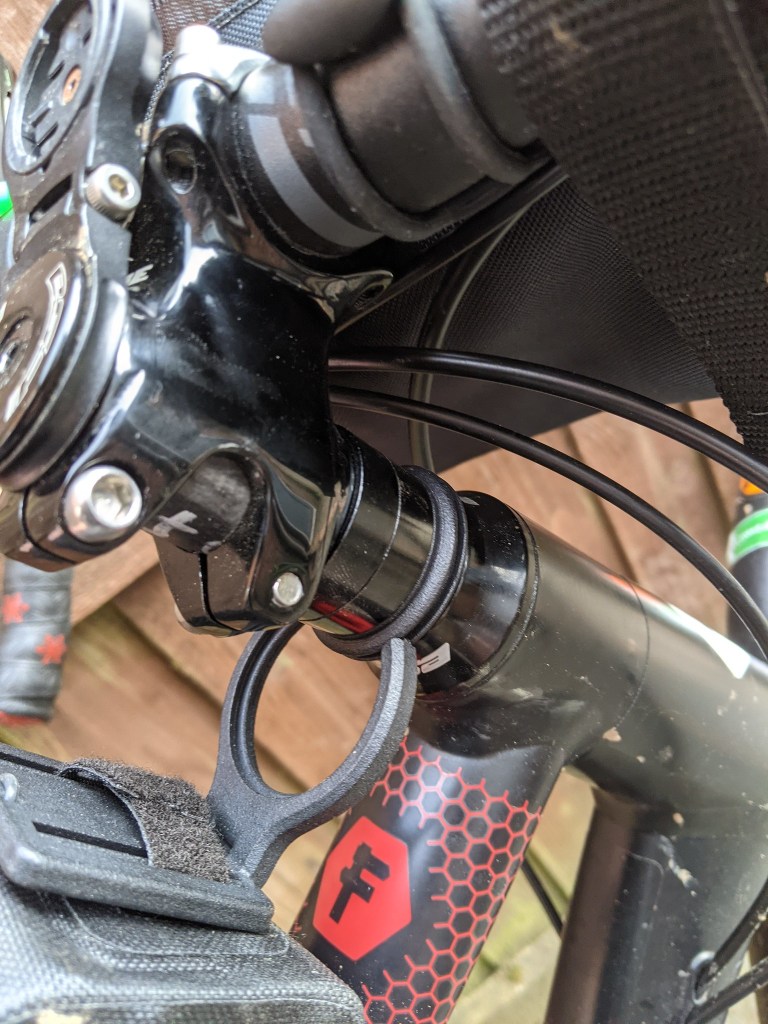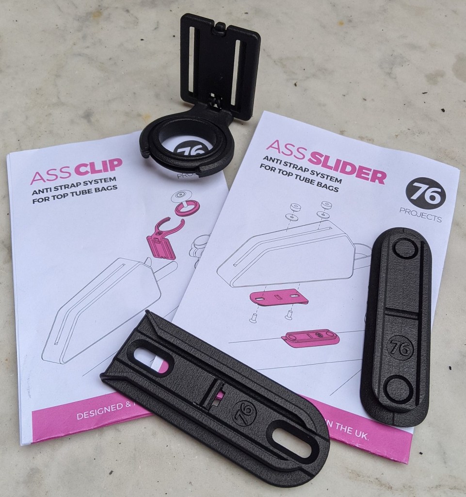 But don’t worry, 76 projects have a cure! and the cure even works on skinny frames that still rely on straps to secure the bottom. The Ass clip consists of a ring that takes the place of one of your headset spacers and an “L” shape bracket, flat at one end with grooves to attach it to your bag and the other a half open loop that neatly and securely fits around the ring on your steerer tune. When attached it allows free movement of the stem and bars but crucially anchors the bag securely with no Floppy Bag Syndrome!