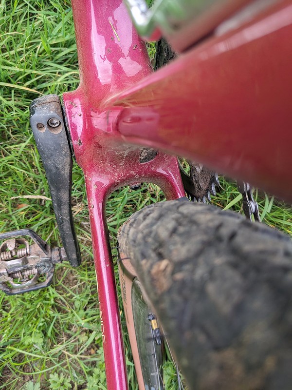 The next big difference on the new frame is tyre clearance. Officially the G2 will take a 50mm tyre with loads of mud room between that tyre and the frame. unofficially, and I’ve tried it, a 2.1″ (53mm) tyre will also fit. So the new trend of big tyres on gravel bikes is covered.