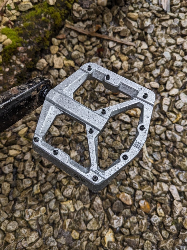 the Crank BrosStamp 2 pedal is from their quite extensive flat pedal range which they have been producing for a long time, so they know what makes a good flat pedal. They come in two sizes, this version is the large and the basic rule of thumb is to size the pedals according to your shoe size, there’s a guide on the Crank Bros website for this. The Body of the pedal is made from aluminium. It comes with 10 10mm removeble pins per side, has a steel spindle and the pedal spins on an inner ignus bearing and twin cartridge bearings on the outside. They are only available in silver or black and have a 5 year warranty. They weigh 494g on my kitchen scales.