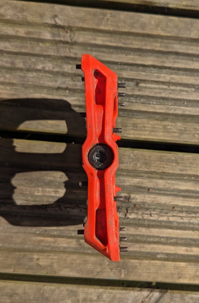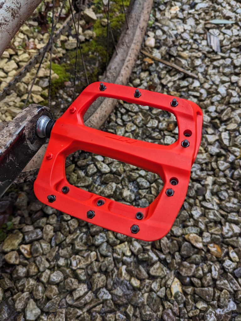 the HT PAO3A pedal in contrast is made of glass reinforced nylon with two in mould pins and 8 replaceable pins per side. Again HT make a huge range of pedals and these come with DU bushings and one dual sealed bearing. The platform is just a hair smaller than the Stamp but weighs less at 351g on my not very accurate kitchen scale. the platform also has the concave shape that is essential in a flat pedal. It comes in just about every colour you can think of and as its “composite” (plastic) there’s no worry about it looking tatty after a few rock or gravel strikes as there’s no paint to flake off.