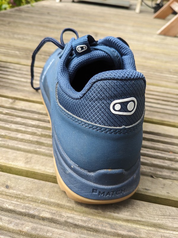 The look of the shoe is very understated (they do a white version too, perfect for UK conditions! 🙂 ) with a blue upper and a brown gumwall sole. there is a reinforced poly urethane toe bumper. the heel is well padded and the laces mean micro adjustments for fit are easy and endless. The upper is perforated for heat transfer. The tongue also has a very neat lace pocket to stop any lace-crank/chain interface. this is much better than the elastic lace strap you get on a lot of these type of shoe. I like the fact that the logos are subtle and don’t shout “LOOK AT ME” which is why you can wear them all the time with pretty much any outfit, I’ve even worn them a few times at work.