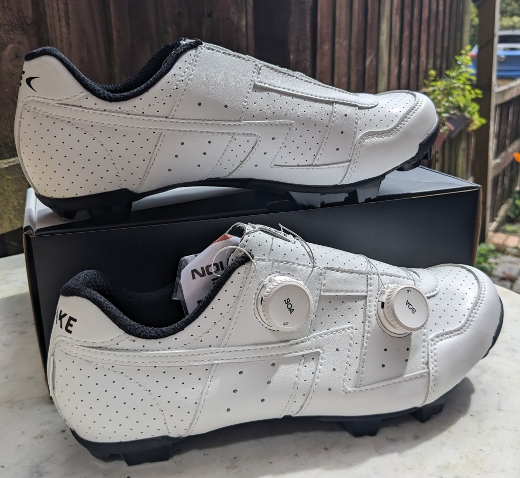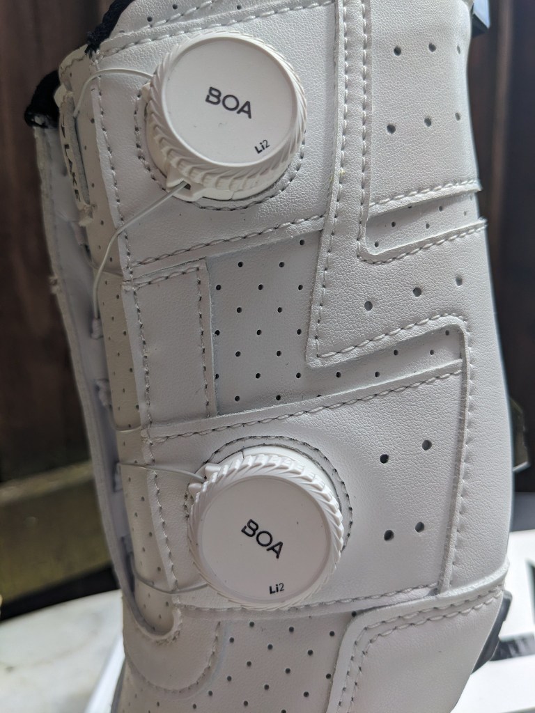 I was sent the clarino microfibre upper version, there is also a mesh version. I think the version sent is best for UK conditions. The material looks robust and equally importantly it looks like it would wipe clean easily. Which given the nature of UK riding (mud, more mud, water and if we’re lucky one day of sunshine) is a very important feature, especially when your shoes are that white! The toe box has extra material around it for reinforcement to take any knocks and the rubber sole extends slightly upward at the toe for more protection and to aid traction if walking. The heel is padded but not bulky and the tongue is soft and comfortable. The shoe is secured to your foot via two BOA dials, these have lots of adjustment by twisting one way or the other and release quickly when removing them. its easy to reach down and adjust the fit while riding too, an advantage the BOA system has over laces.