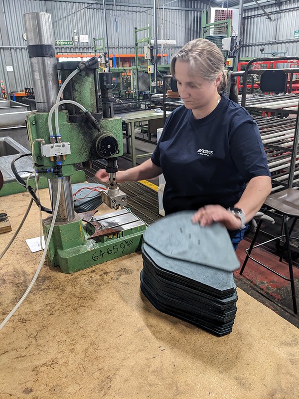 we went from raw materials through to the finishing touch of riveting the Brooks logo, also stamped in house, to the saddles. At every stage there was a human operating the machinery, it was mass production but on a much smaller and personal scale than I’d expected before visiting.