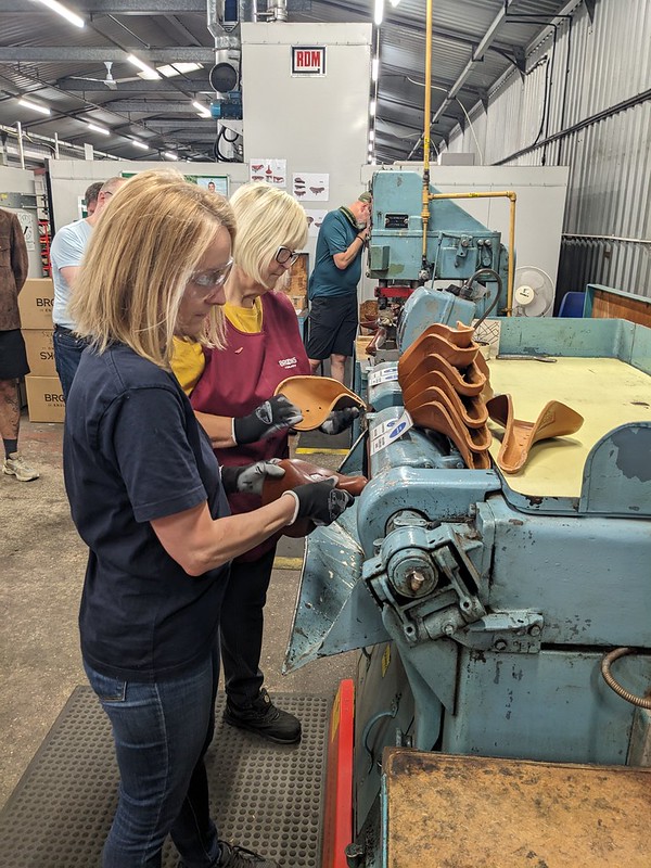 The tour progressed from the very vintage presses which were very loud to the cutting out of the leather which is soaked in water to soften it before it’s put into a press/shaper. Some of the machines were over 100 years old and i asked one of the guys, what happens when one of these machines that hasn’t been in production for so long breaks? He said, we just make a new part from scratch for it and if we can’t do it Birmingham’s renowned jewelry quarter is a couple of miles away and there are small factories there that can make anything you want.