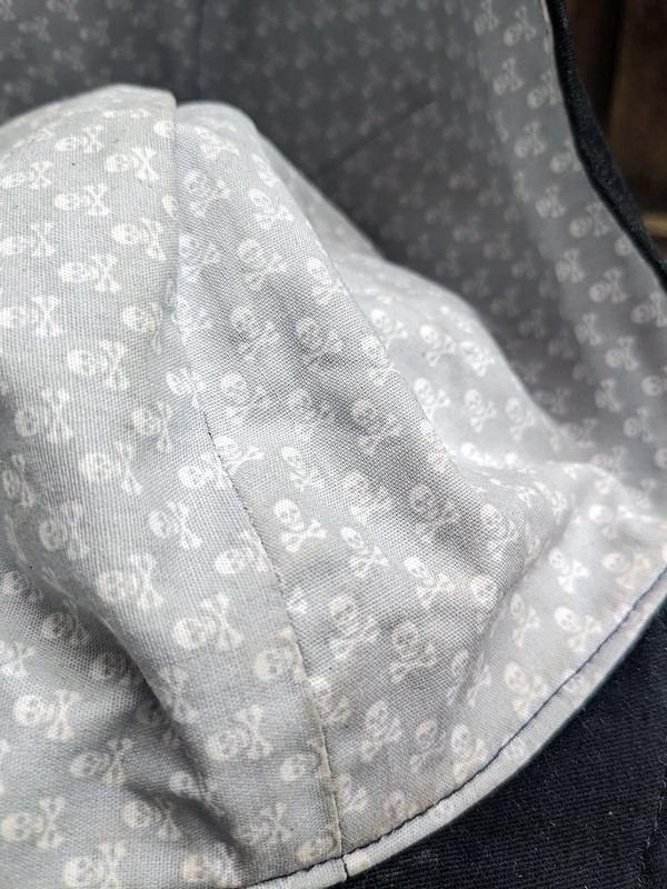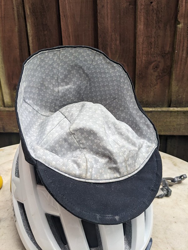 A few days later a parcel arrived for me and the cap in the pictures was the result. This navy blue cap is very understated, i was expecting something much more jazzy but I have to say it looks classy and not out of place in the non cycling side of my life, then i checked the lining material which was covered in a skull and crossbones material! A hidden treat.