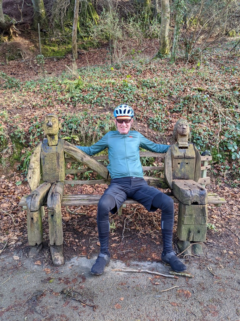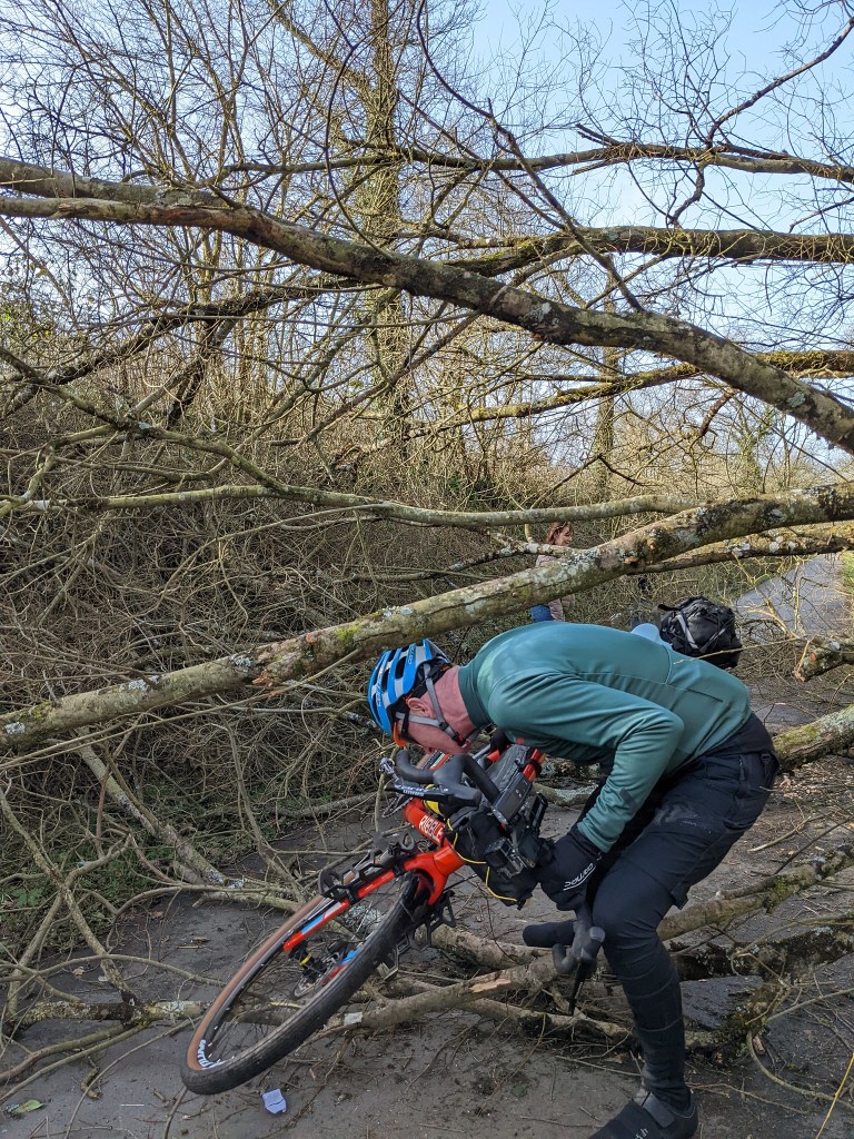 Faces stuffed with pastry we carried on through very pretty countryside, over more fallen trees, dodged council workers with tractors either trimming blackthorn hedges or cleaning up debris (still no punctures)