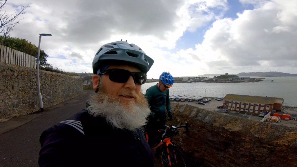 Over some moorland following a very steep long climb we began to encounter signs of “civilisation” in the form of a golf course. Clearly they didn’t want a cycle path through their patch and so there was a lot of pointless gates and signs warning us not to stray onto the artificial countryside they had groomed, no danger of that from us! Then things got more and more urban as we reached Plymouth and the coast. Cycle paths next to dual carriageways are never fun but given that the alternative would be to be riding on the dual carriageways with the cars and lorries it was much preferable. then at last we made it to the sea!