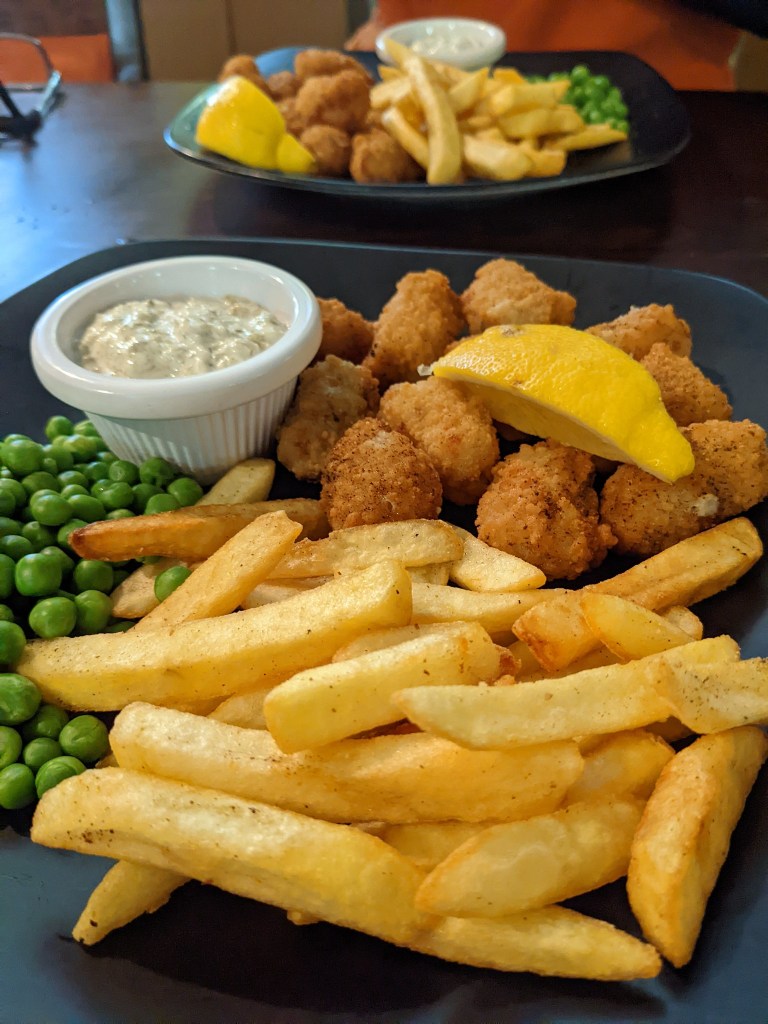 After an “entertaining” taxi journey listening to the drivers tales of cyclists who had needed his services over the years (thank goodness Russ was up front so had to make conversation while I dosed in the back) we finally made it back to Ilfracombe at around 6pm. A quick stash of the bikes in the van and we headed down to the seafront for a chippy tea, Fish and chips never tasted so good!