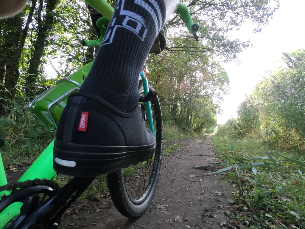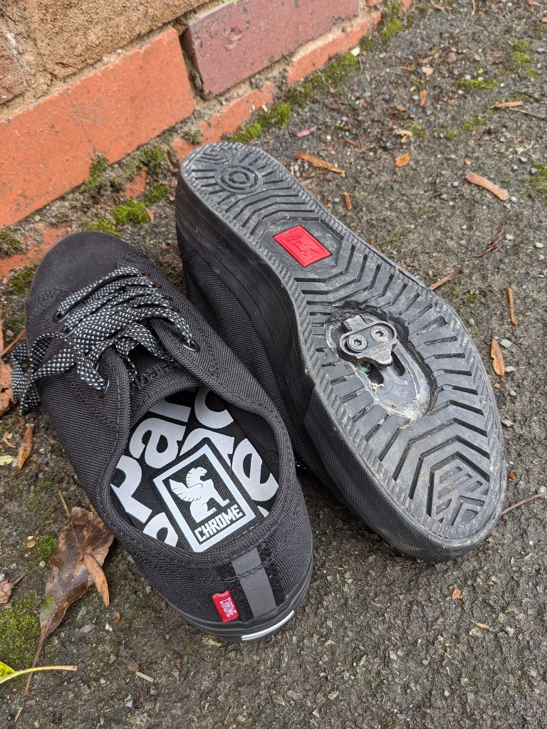 I’ve long been a fan of the skate type shoe for messing about both on and off bikes as they are so comfortable. I’ve seen the clip in style skate shoe before and always been a bit skeptical that the combination of soft grippy sole and an spd cleat wouldn’t work. So when Chrome offered me the chance to test a pair i was all ears…or feet.