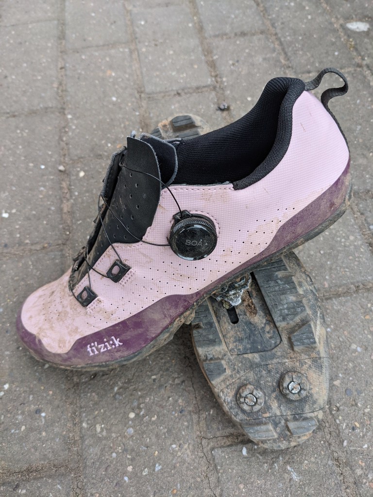 So, lets talk about fit. Cycling shoe manufacturers, especially Italian in my experience tend to be quite narrow in their fit. On the advice of Extra I went with my standard size 44 (happily Fizik offer half sizes too) hoping that the claimed more generous fit would be proven correct. I needn’t have worried, the fist try on and walk about in the house showed that they fitted just as nicely as my lace up terra’s. The boa adjuster allows quite micro adjustments and although doesn’t have as much “give” and movement as a lace they can be dialled in (yes intended!) easily and adjustments can be made while riding too to cope with feet getting hot or cold, something not possible to do with laces unless you are a lot more skilled than me! There is plenty of room in the toe area to wiggle and no heel lift even when walking about. there was no break in period either, the synthetic upper is supportive without being restrictive and there’s no ankle protection which I hate on other MTB focused shoes, they fit like normal shoes.