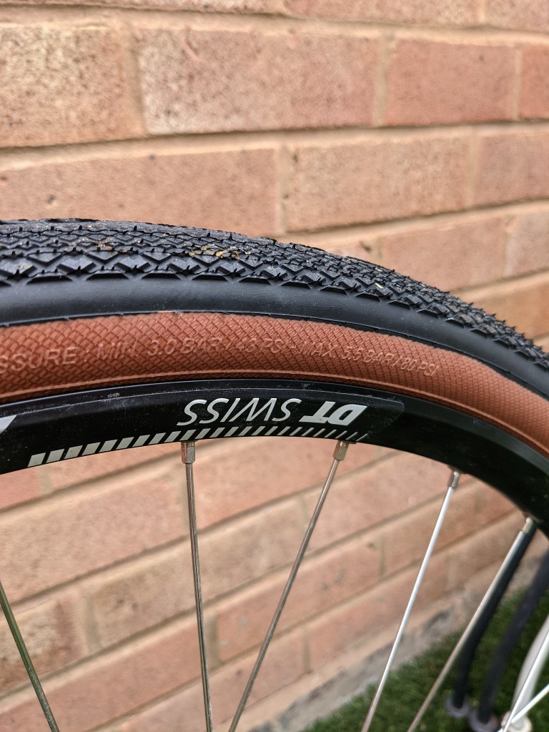 The tyres have a diamond shape tread pattern that is shallow in the middle and slightly taller on the shoulders to aid cornering traction (designed for dry conditions). they are tubeless set up ready and come in tan wall or black wall versions. I chose the 38mm version and they seated easily on some 25mm internal width rims.