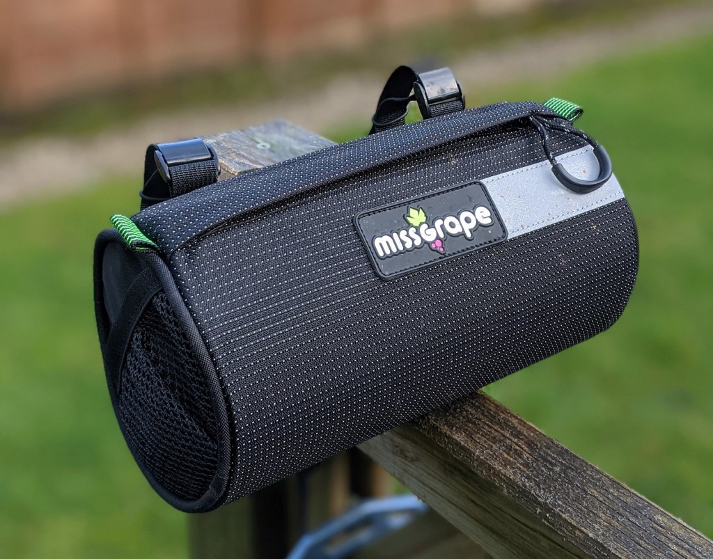 The Bag quite simply is a cylinder with a zip across the front, four attachment points, two of velcro and two with the same style of fixings seen on the Node top tube bag with a stabilising strap that goes around the frame head tube and it is also made of the same weather resistant material as the Node. On each end of the bag is a mesh elasticated pocket for stashing stuff you need to get to while riding along. Although the main zip is purposeful enough to enable opening while moving too. Inside the bag is a plastic stiffener that helps keep the bags shape and structure.