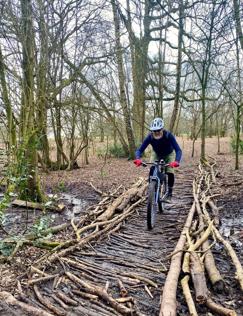 As we were riding along Dan and I were discussing the fact that because riders haven’t been able to travel to riding spots that there had been a lot of trail building going on. Most of the trails locally have been there for years and are away from the most popular walking paths. So generally there’s not too much conflict between cyclists and walkers. The area is owned and looked after by the local council. The woods are maintained by the local ranger service working for the council and as long as the trails aren’t overly dangerous, there are “chicken” runs and they don’t use footpaths the rangers turn a blind eye. We’d never ride at peak times, such as Sunday afternoons in normal times as it’s just too busy with families , dogs and horses. However, in lockdown it’s busy all the time and I guess the local riders are bored so many new trails have sprung up and go across footpaths and paths that get very busy.