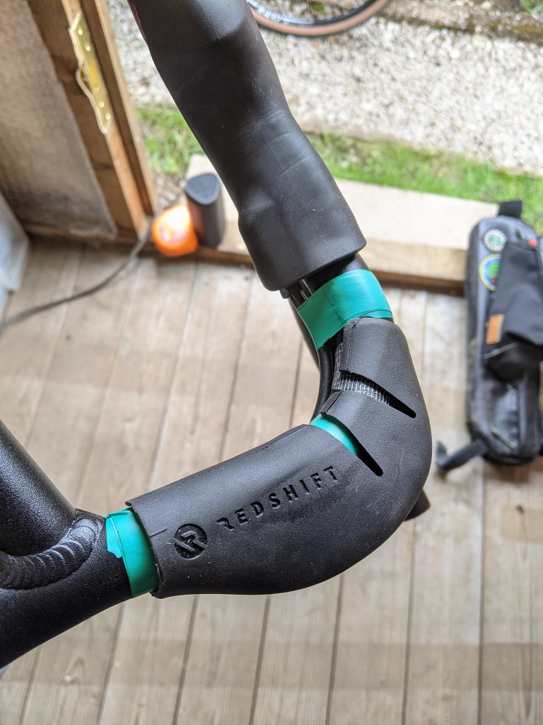 Installation is fiddly there’s no denying it but nothing the home bike enthusiast couldn’t cope with and there are very detailed instructions and sticky pads and positioning tape in the box. You will need to replace your standard length bar tape too though as the extra volume of the Top Grip takes a lot of wrapping. Redshift also sell a “really long bar tape” set though to solve that problem. you need to position the Top grip where you want it first and I’d recommend going for a gentle ride to check this first BEFORE putting the bar tape on as once set the position will be nigh on impossible to move without removing the bar tape you took ages getting just right, ask me how i know that!?